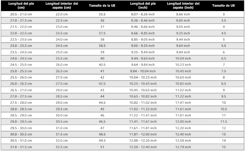 Los tamaños de zapatos no están estandarizados. Cada fabricante de calzado utiliza diferentes medidas en términos de altura del empeine, forma de la puntera y ancho del pie. Sin embargo, la base de su propia talla de calzado es siempre la longitud de sus pies. Por lo tanto, siempre debe determinar la longitud de su pie antes de comprar para elegir el zapato adecuado.